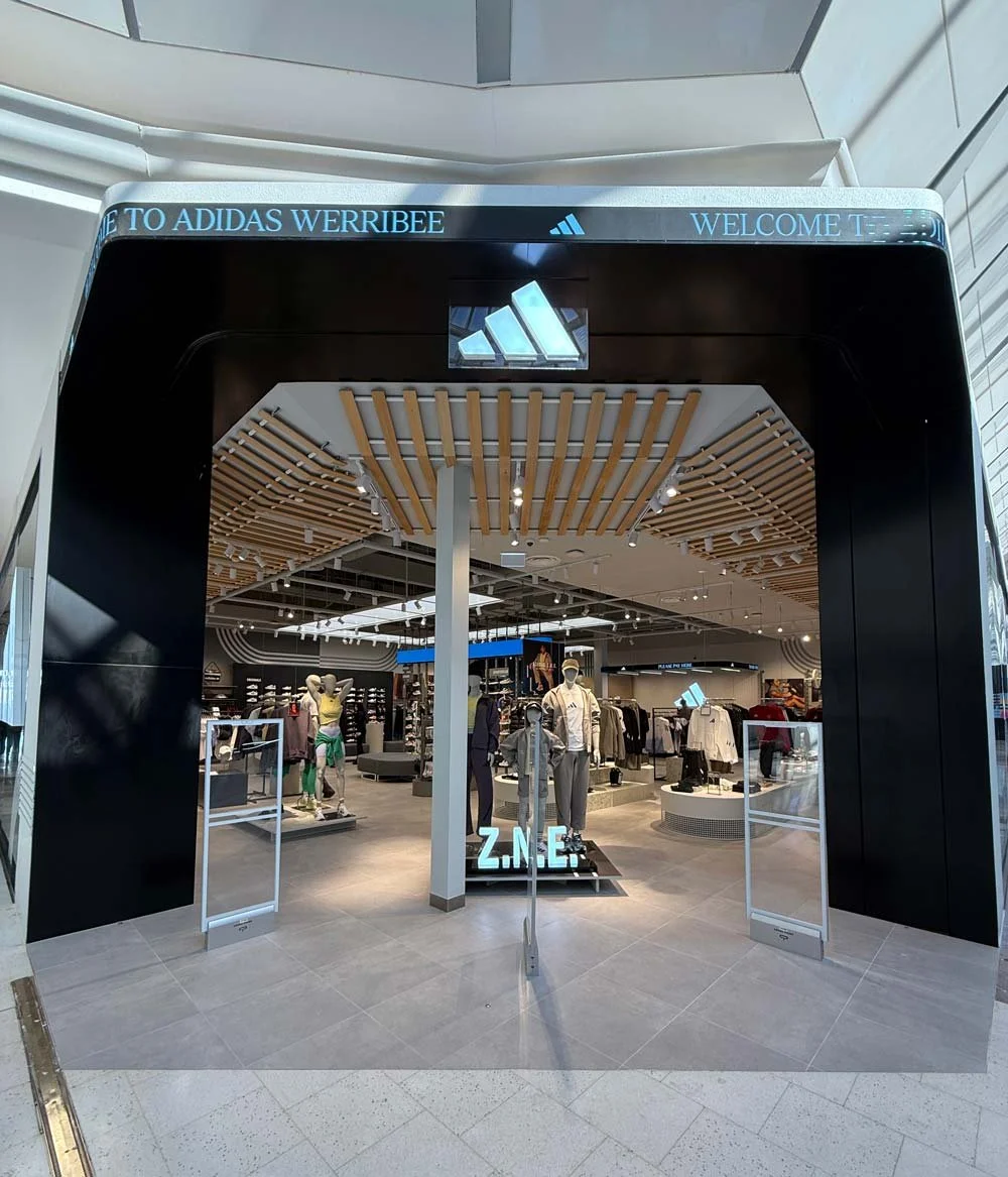 Adidas Werribee Pacific is a completely new store Fitout. The store features glazed shopfront with stippled render panels and impactful black powder coat entry leading into the store.