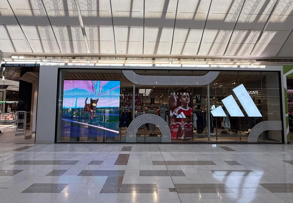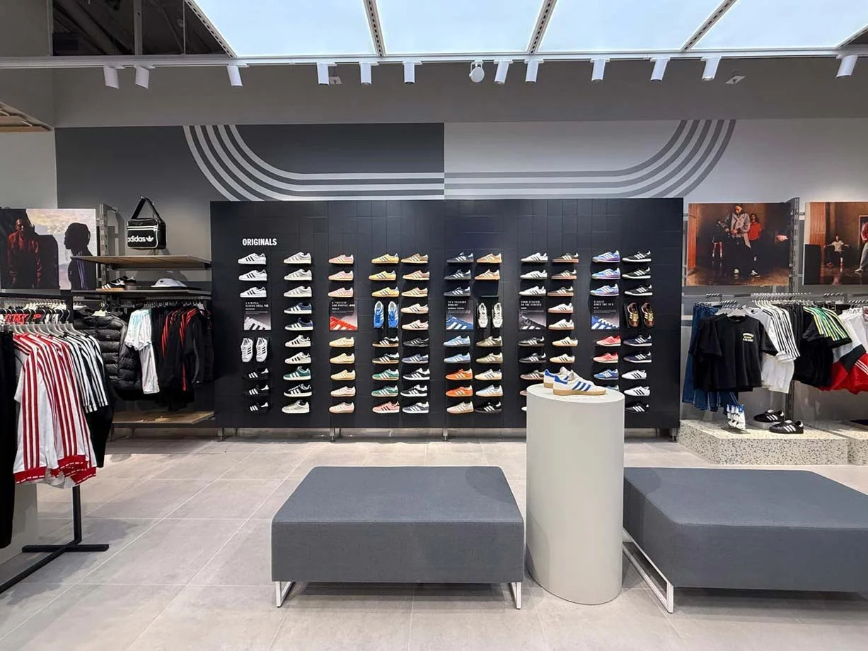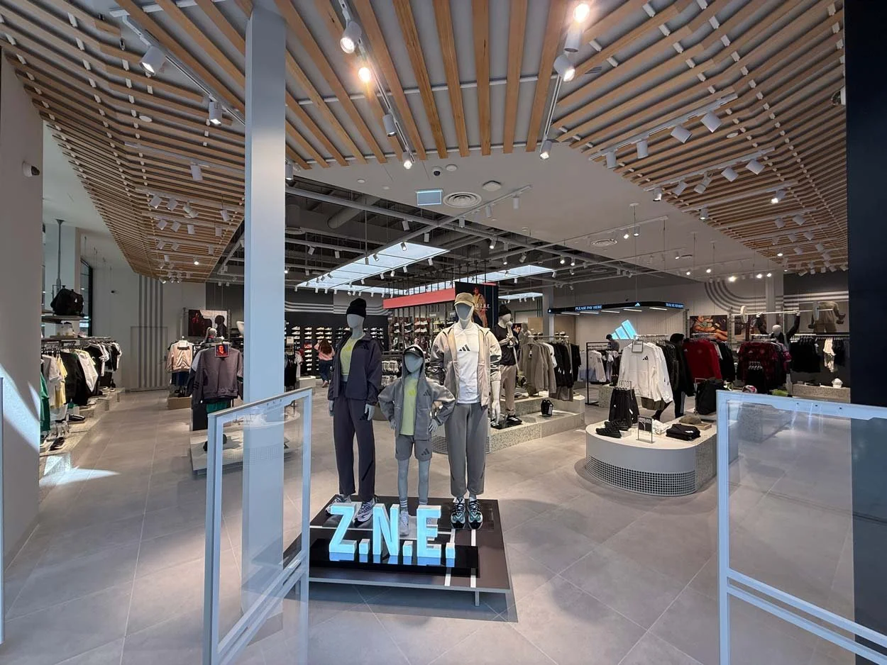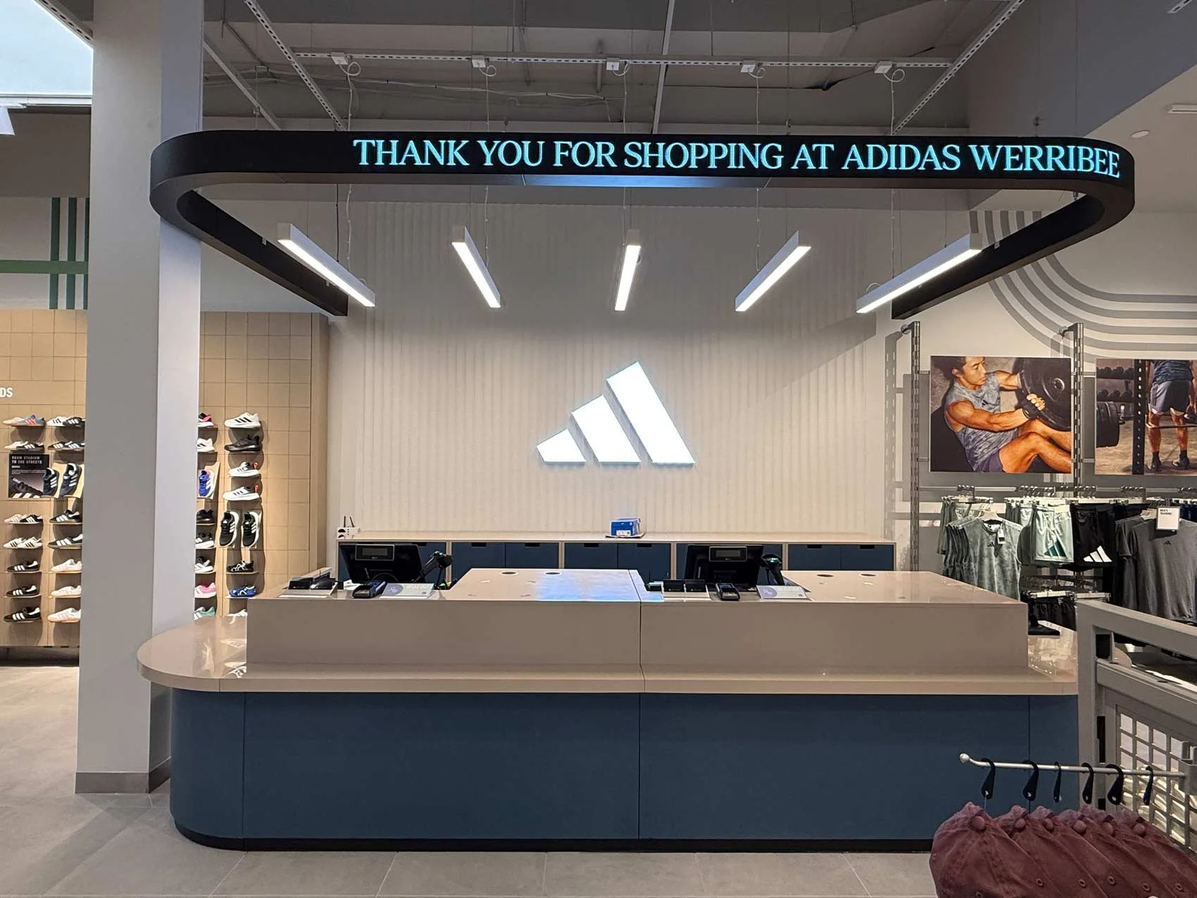 Adidas Werribee Pacific is a completely new store Fitout. The store features glazed shopfront with stippled render panels and impactful black powder coat entry leading into the store. Internal features include an extensive slatted timber ceiling feature and square lighting pads to elevate key instore display features. The overall colour palette is gray floors, walls and ceilings with colour pops utilising joinery and Innovative brand signage and display elements.